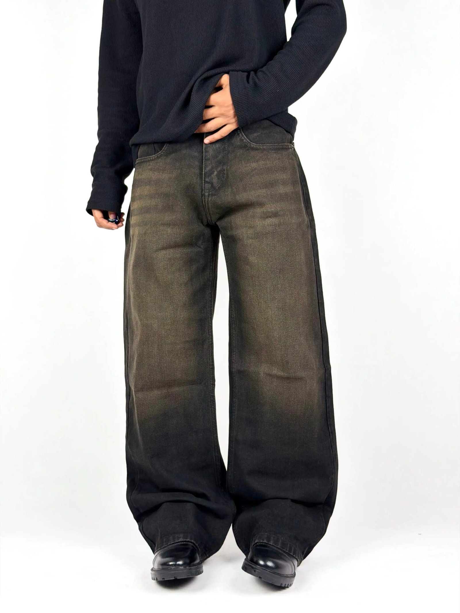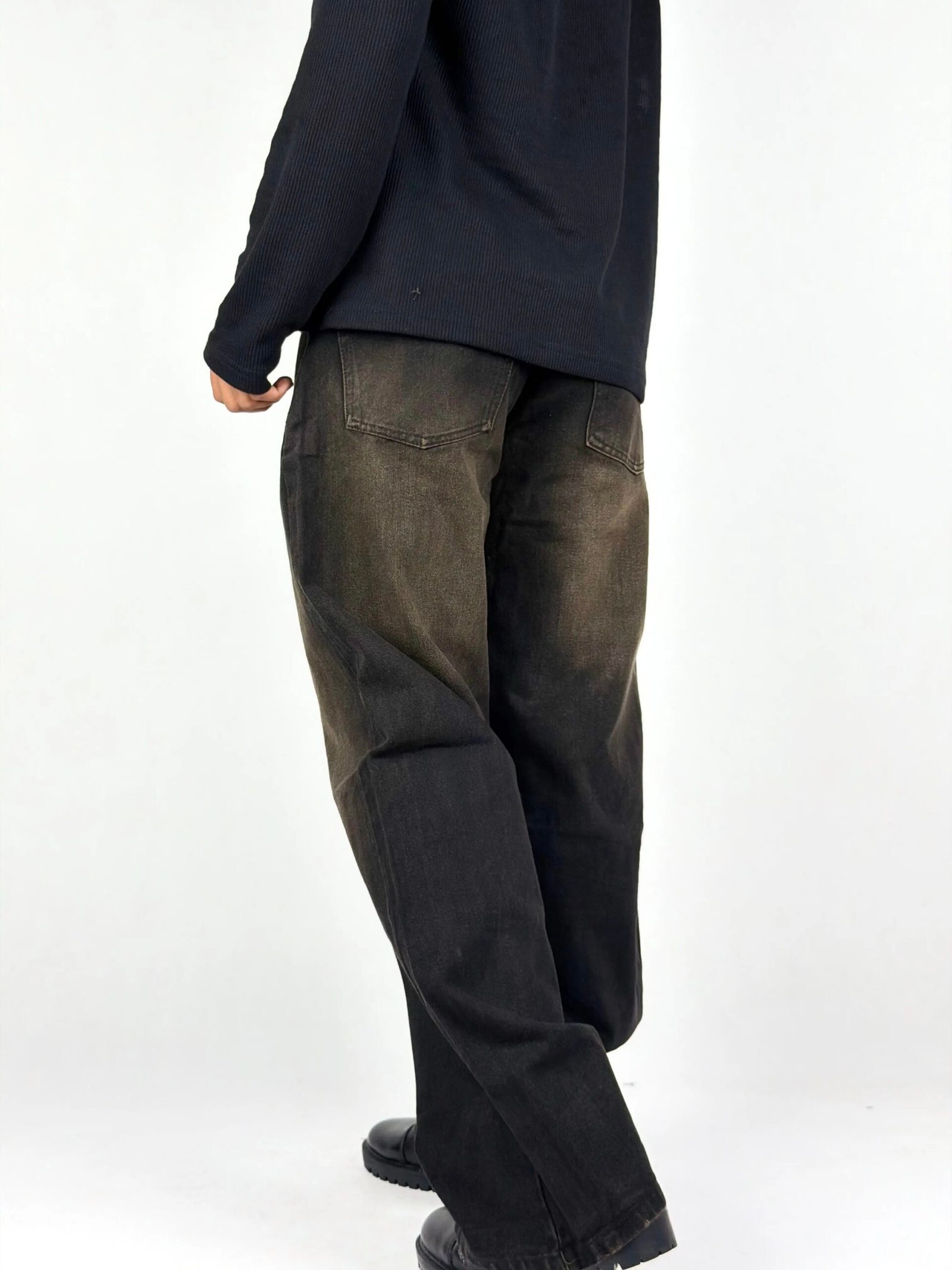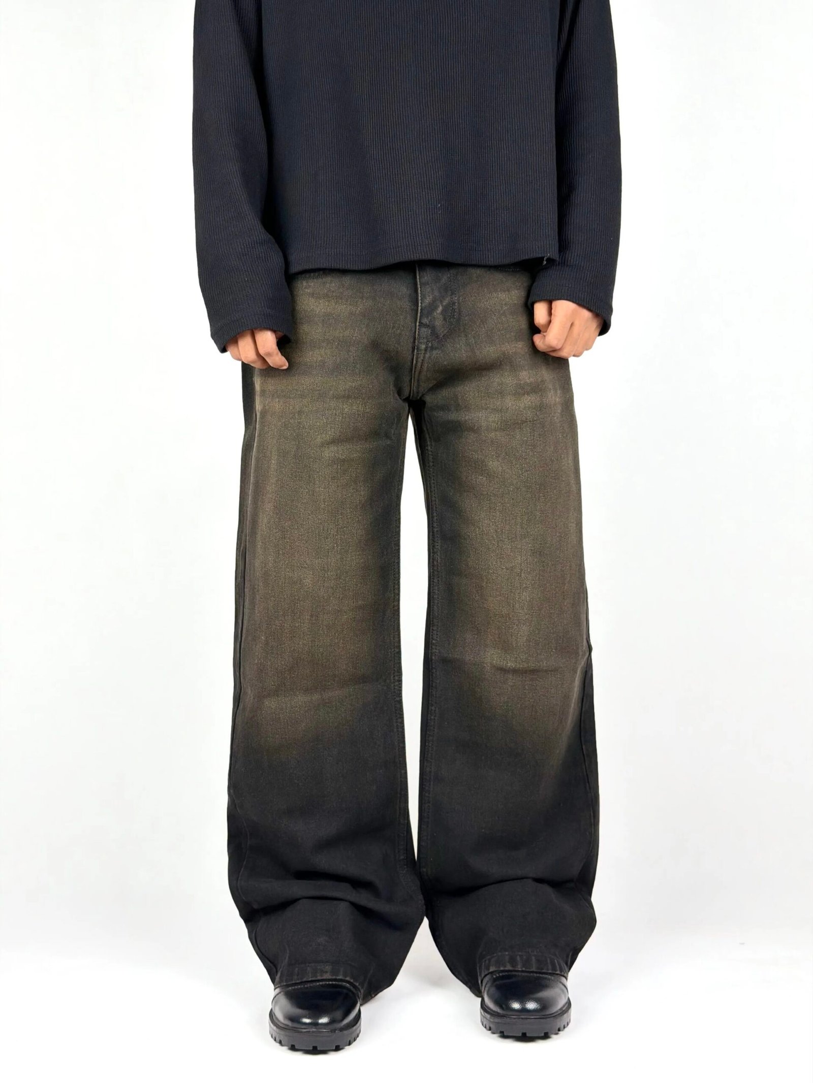 A rugged reinterpretation of relaxed fit denim, defined by its raw, dusted fade and earthy undertones. The washed surface carries a naturally worn-in character, blending darker shades with subtle highlights to create depth and texture that feels authentic and lived-in.