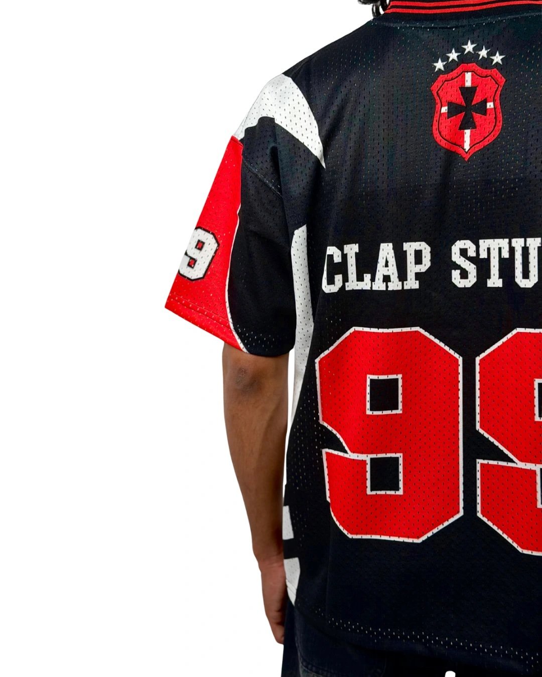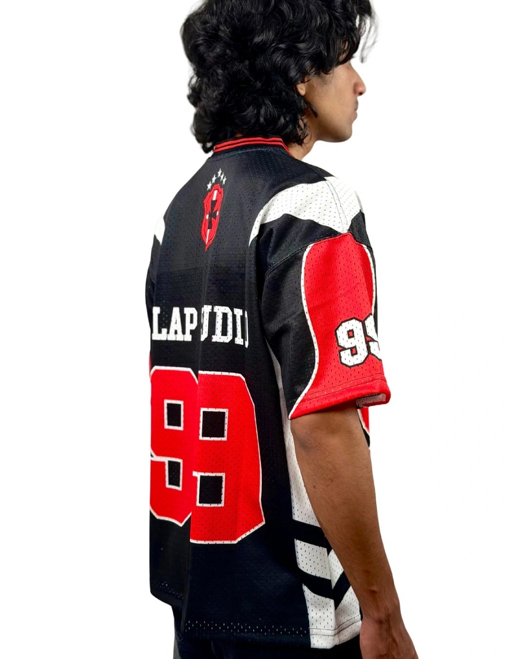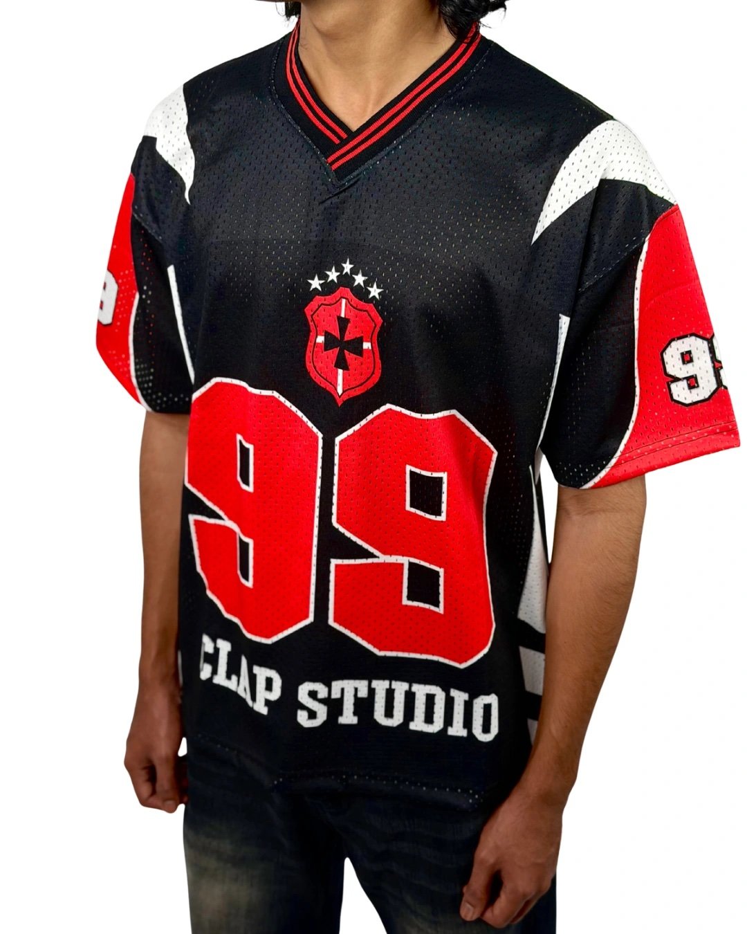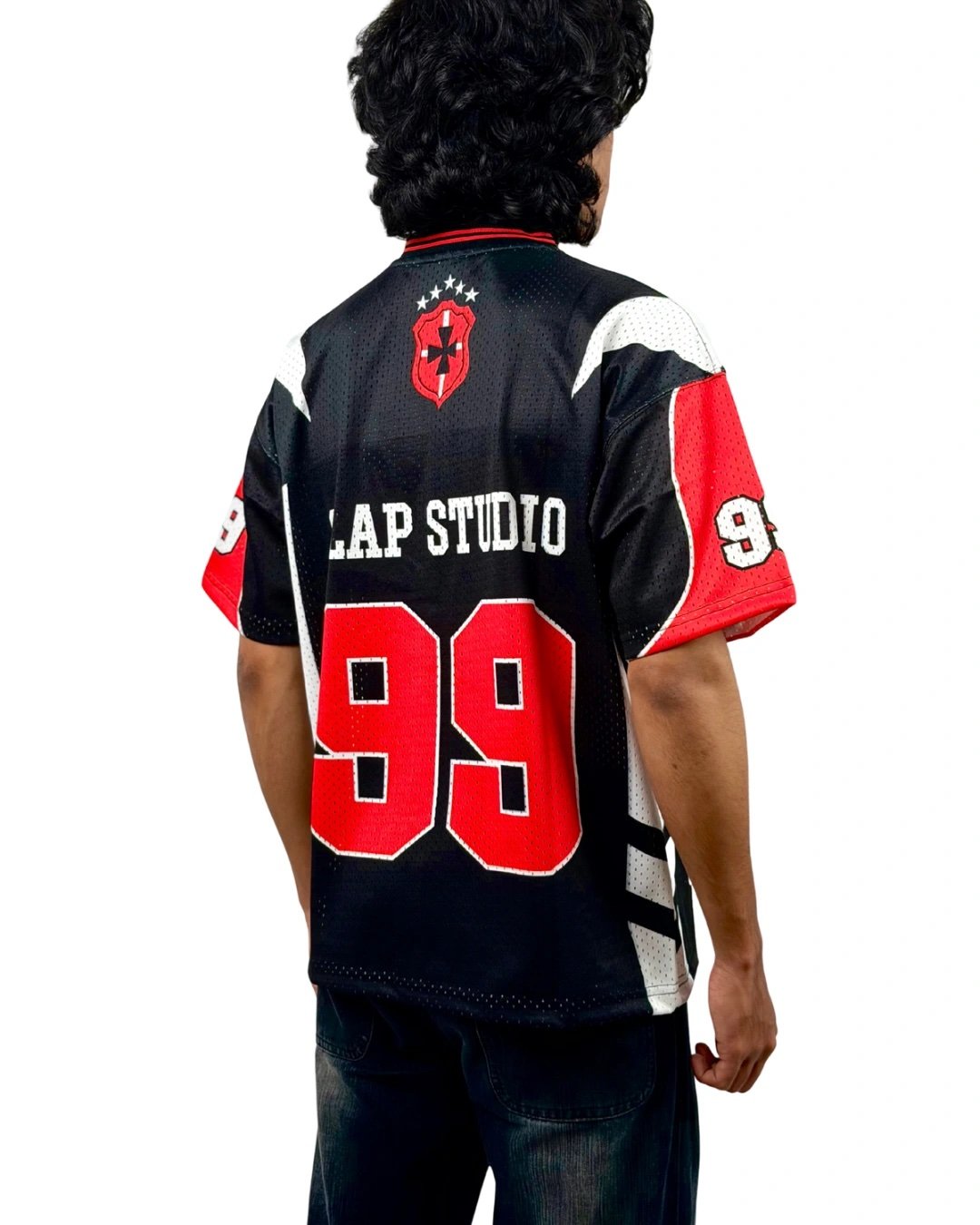 Built with a strong street identity, the Crimson 99 Street Jersey delivers a perfect blend of athletic energy and urban style. Crafted in breathable mesh fabric, it features a bold “99” front graphic, contrast red panels, and signature sleeve detailing. The black base with sharp red and white accents gives this jersey a powerful, game-ready look — ideal for everyday street fits or standout layering.
