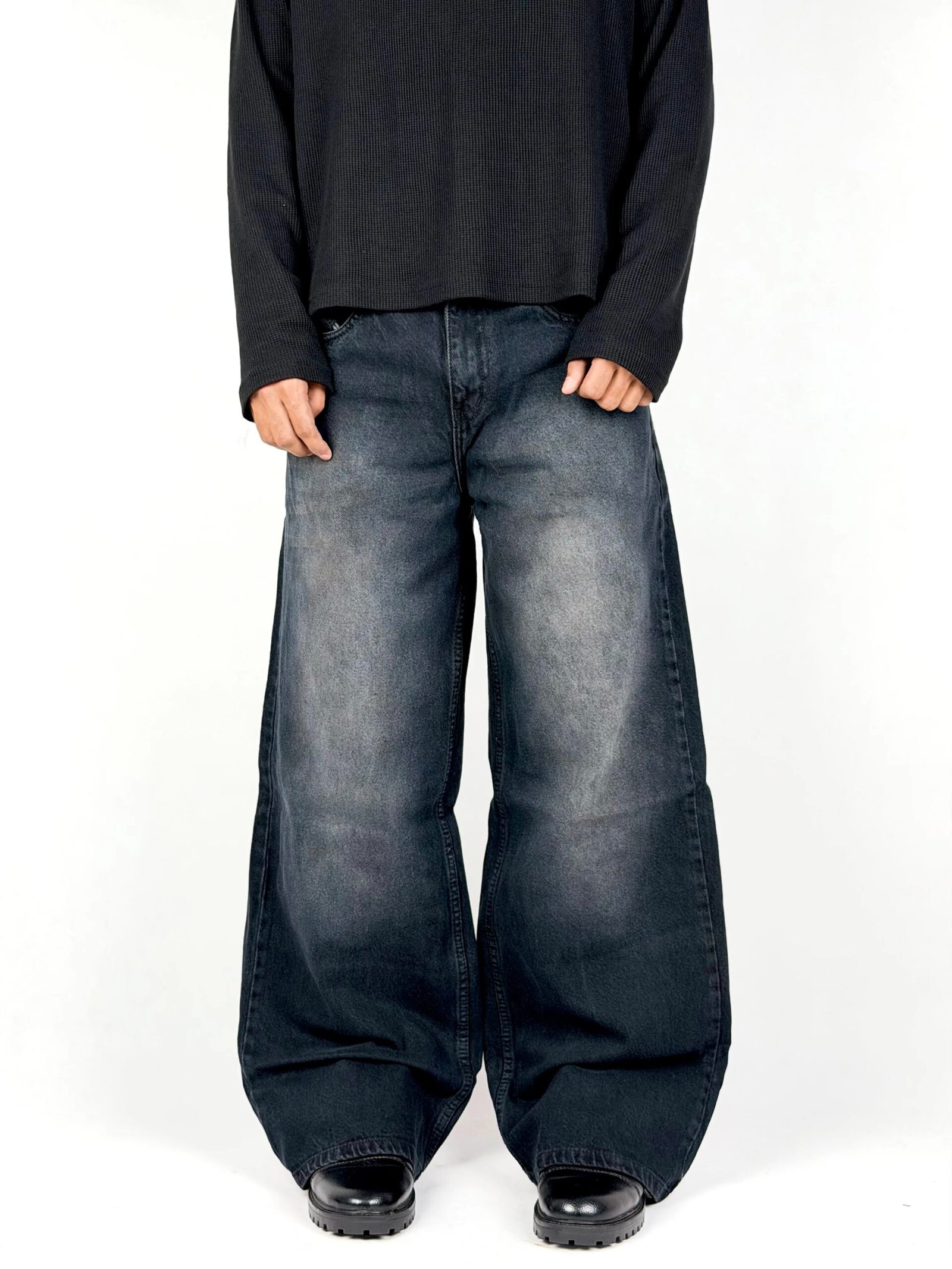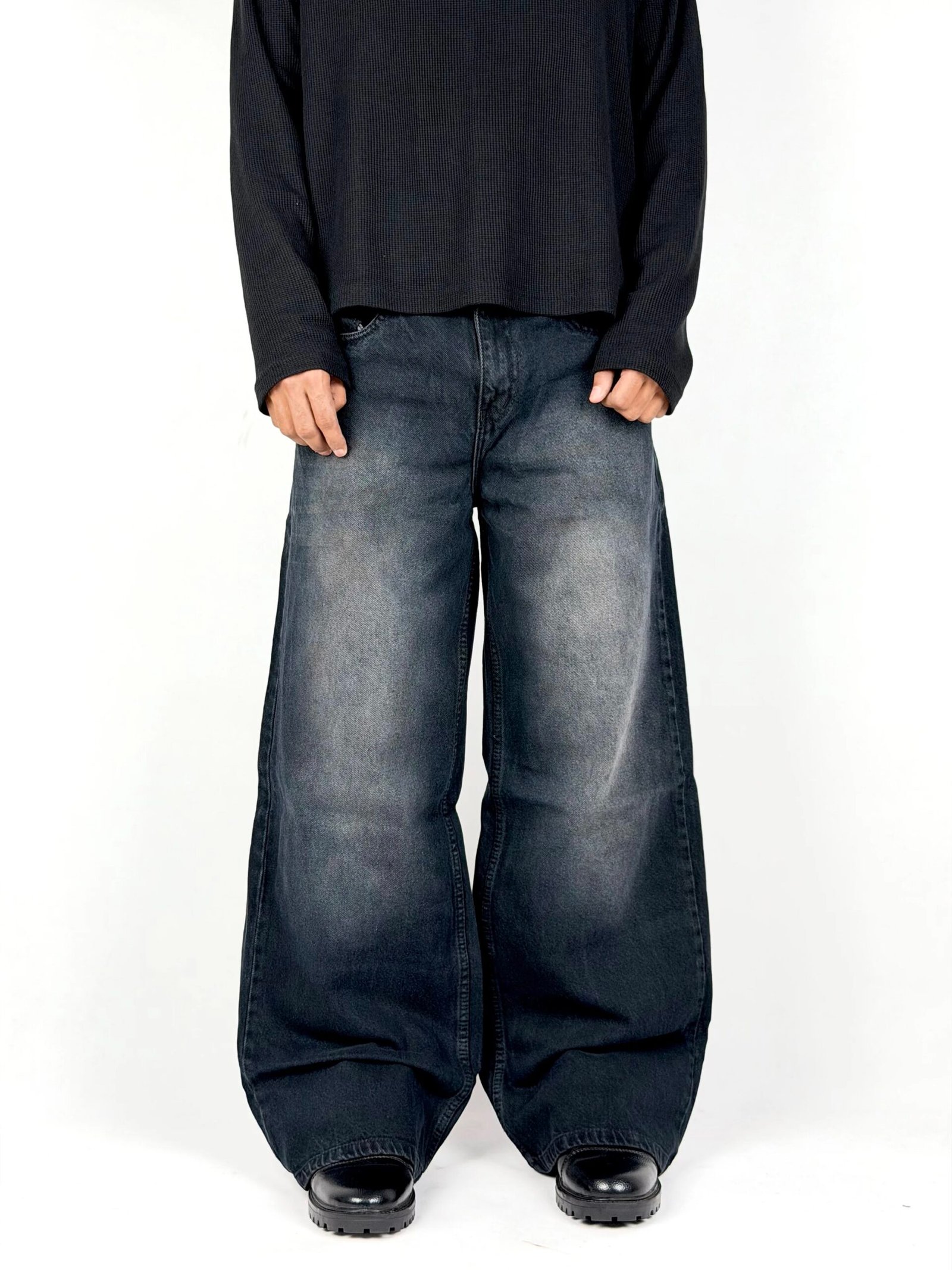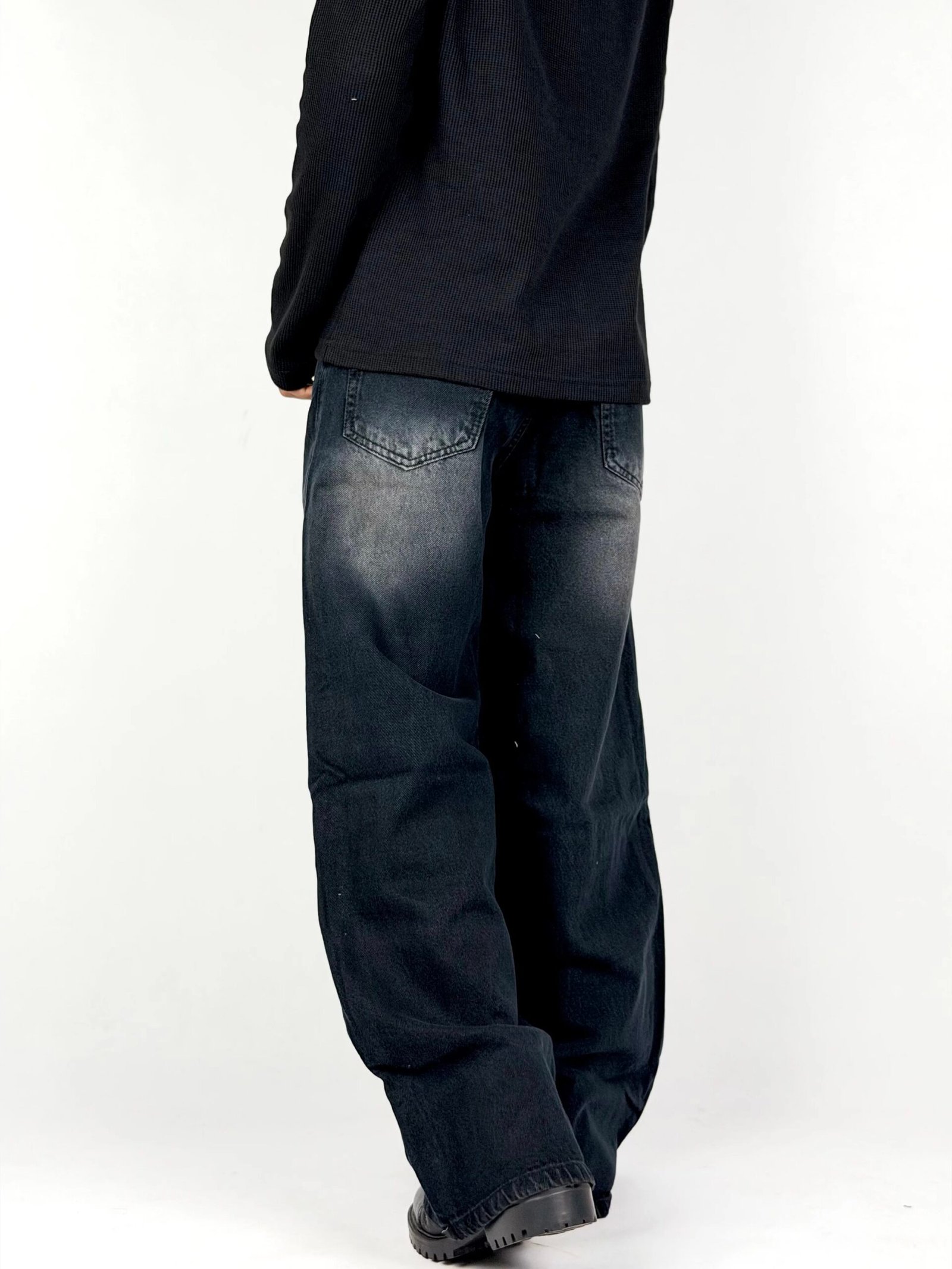 Built for statement fits, this wide-leg denim comes in a deep charcoal wash with bold, natural fading that adds depth and character. The oversized silhouette delivers a strong, relaxed drape, giving it that effortless street presence. Subtle whiskering and worn-in textures create a vintage feel while keeping the look clean and modern. Designed to stand out without trying too hard—this pair moves with attitude and pairs seamlessly with minimal or layered outfits.