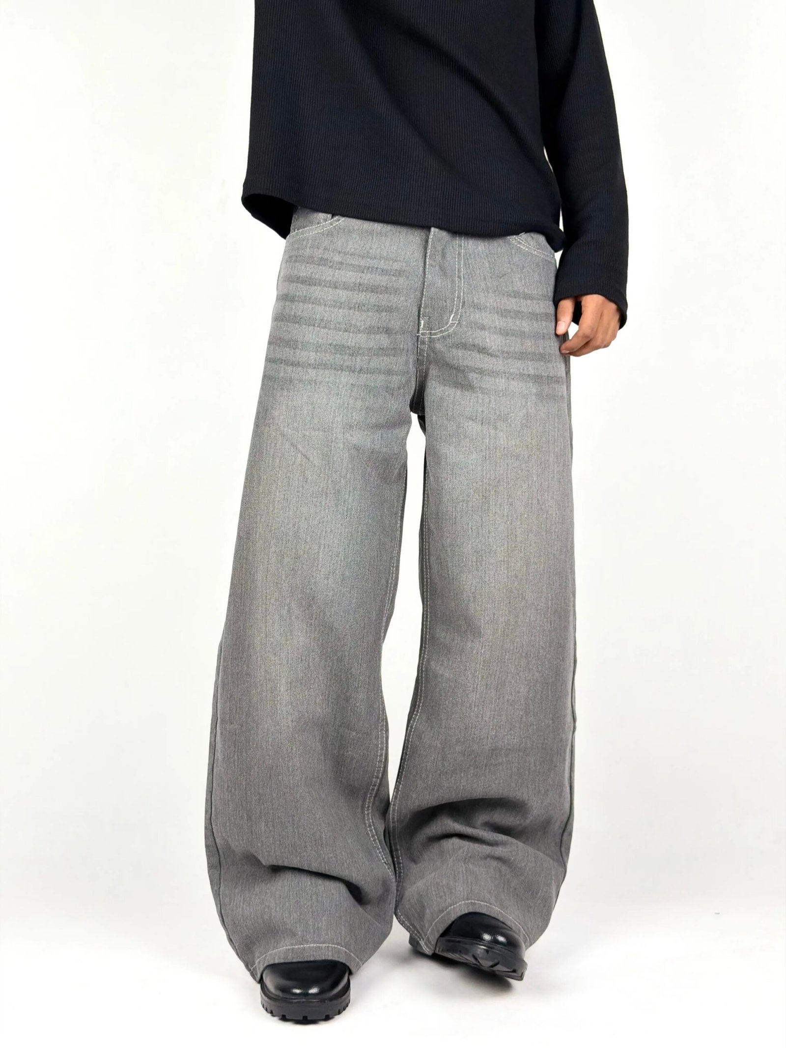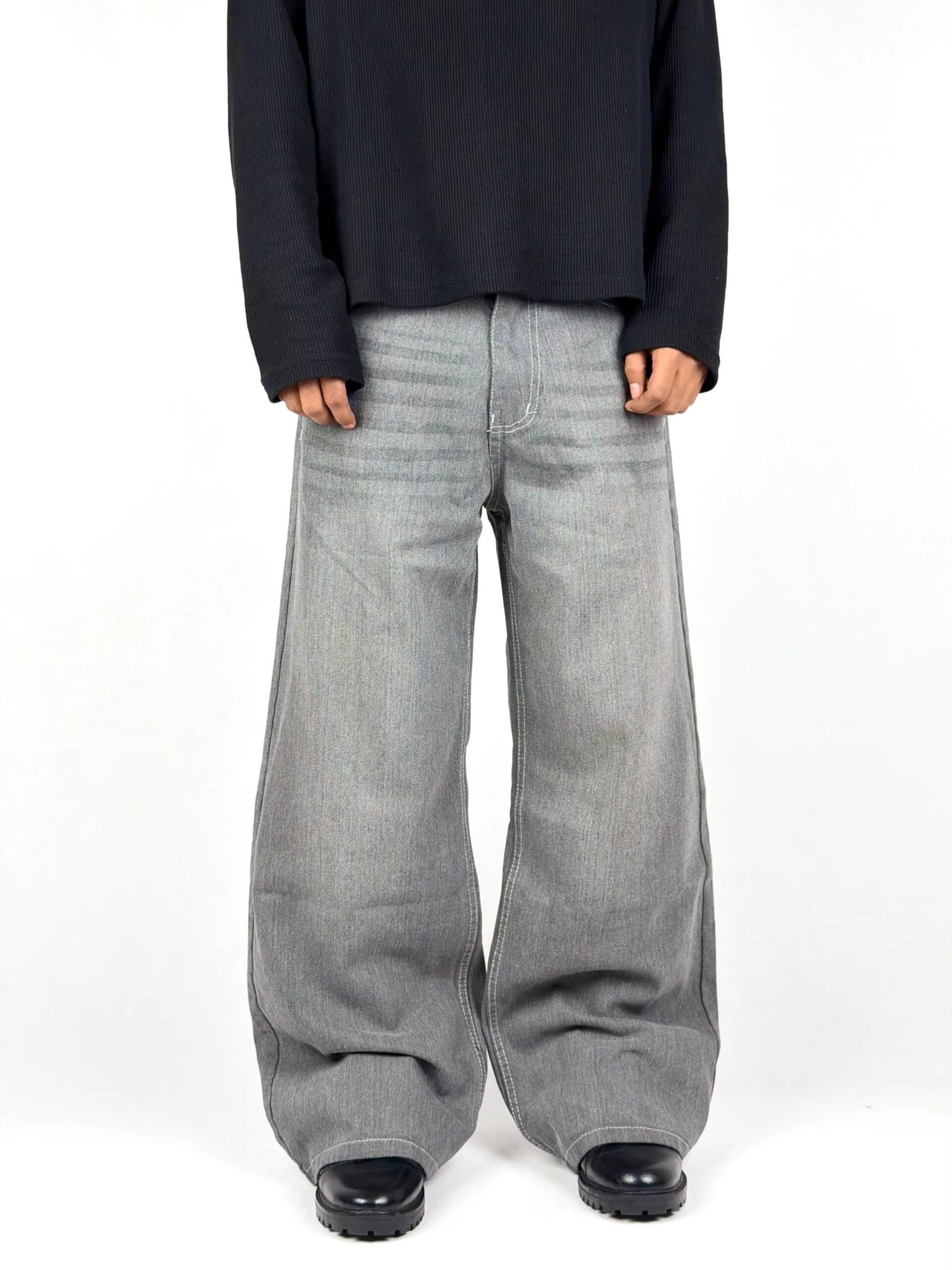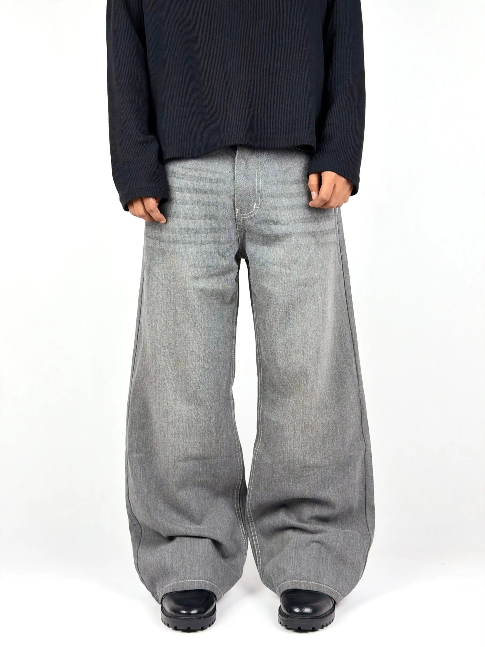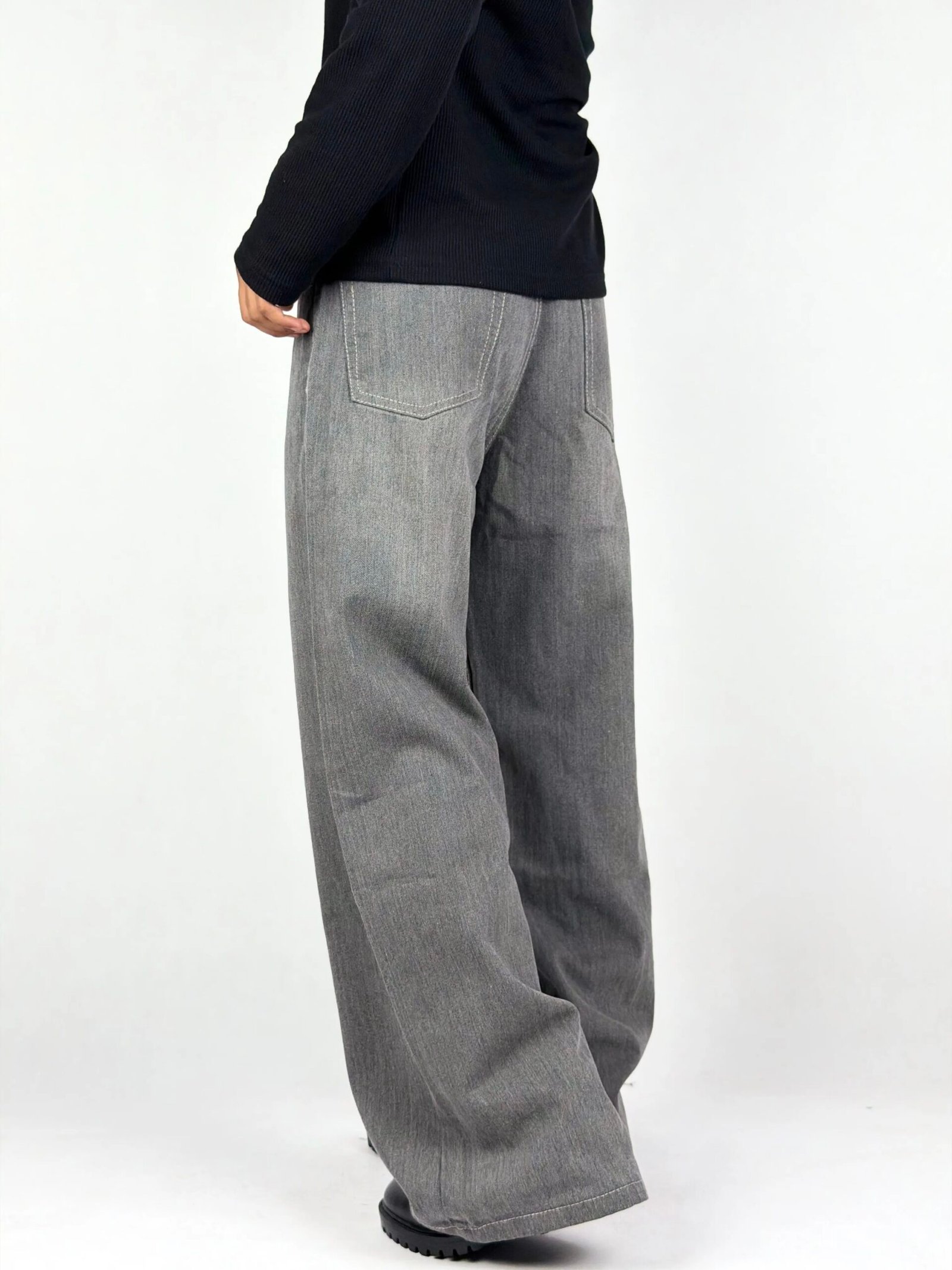 A refined take on wide-leg denim, designed in a soft grey wash that emphasizes simplicity and versatility. The subtle fading across the surface adds gentle depth, creating a clean, understated look that fits effortlessly into both minimal and statement styling.
