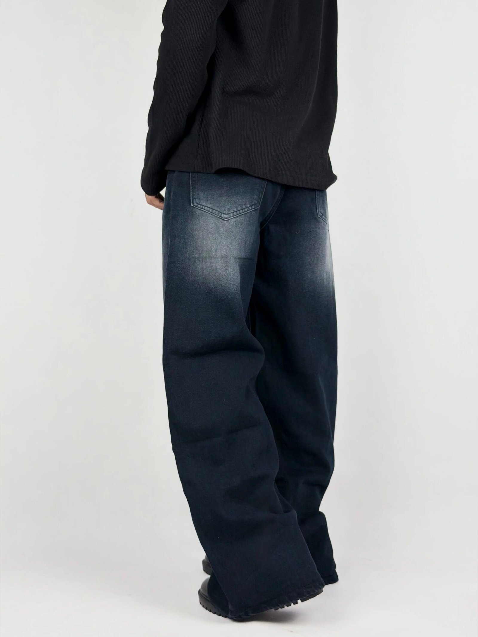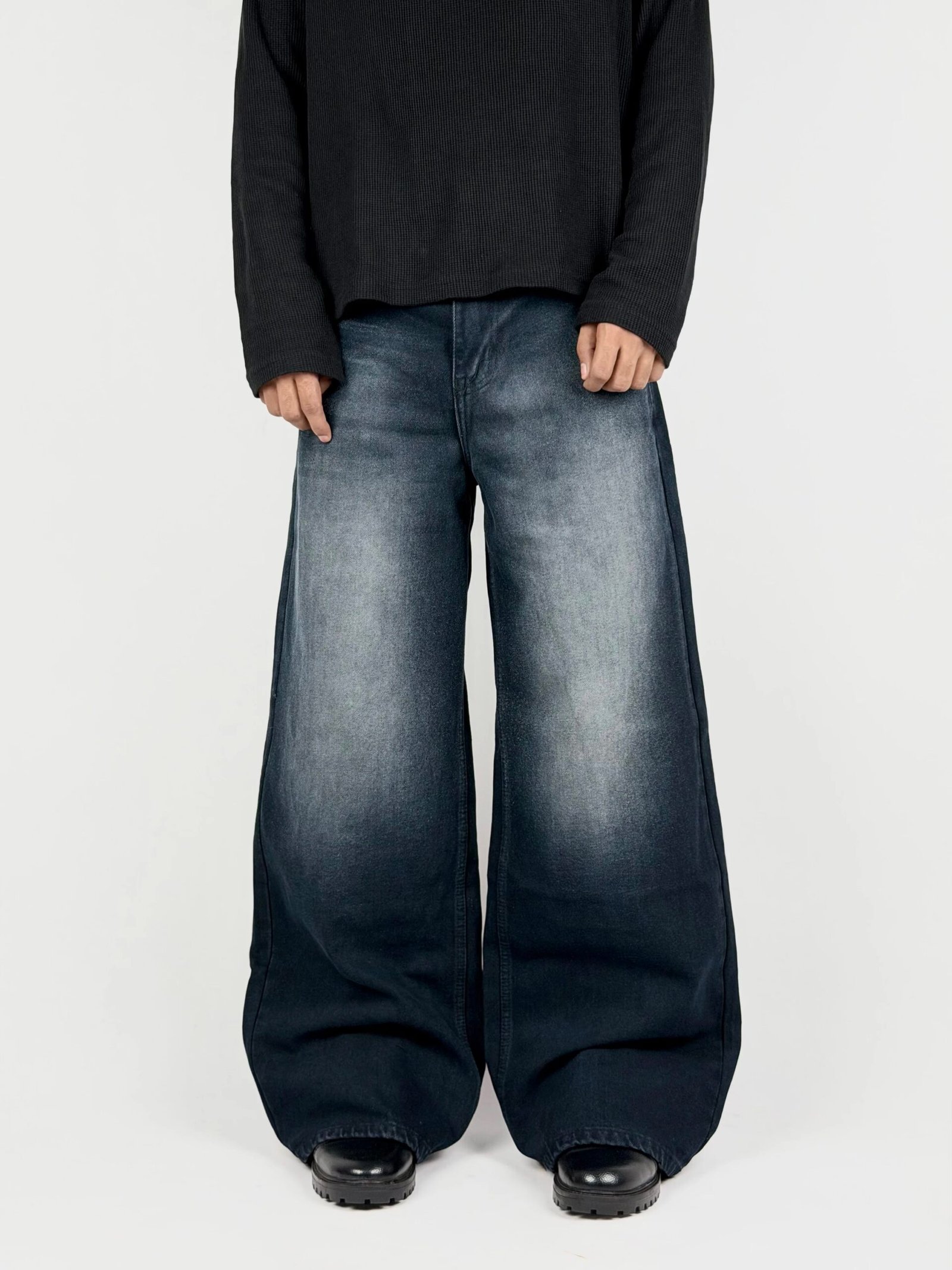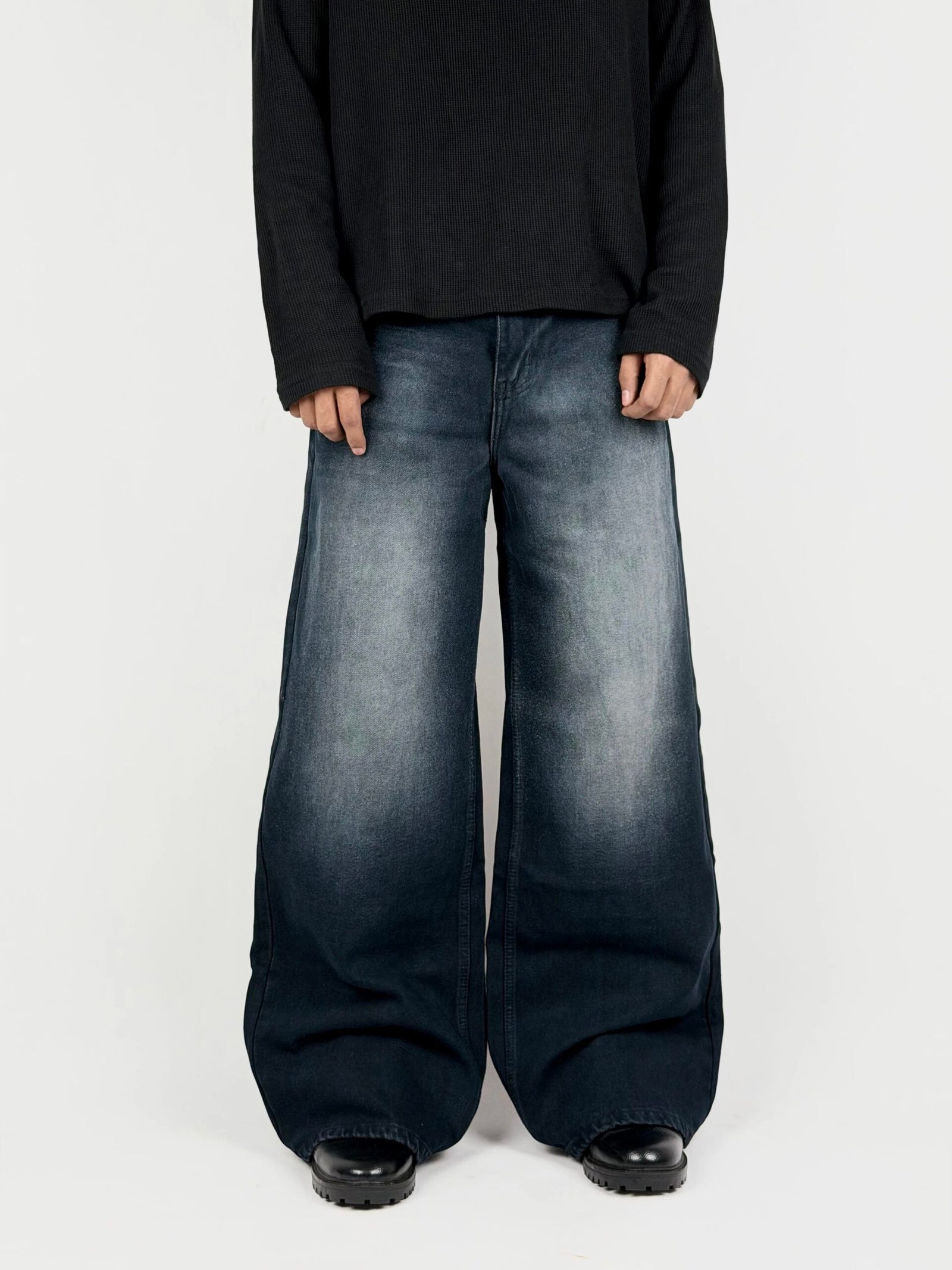 A bold oversized denim crafted with an exaggerated barrel-leg silhouette and dramatic volume from hip to hem. Finished in a deep indigo wash with soft faded whiskering through the thighs for a worn-in contrast. Designed to stack naturally over footwear, creating a strong streetwear-inspired shape with effortless movement and attitude.